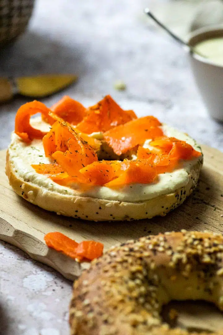 Serviere die Karottenbänder mit etwas Meerrettich-Dip auf einem Toast oder hausgemachten Bagels.