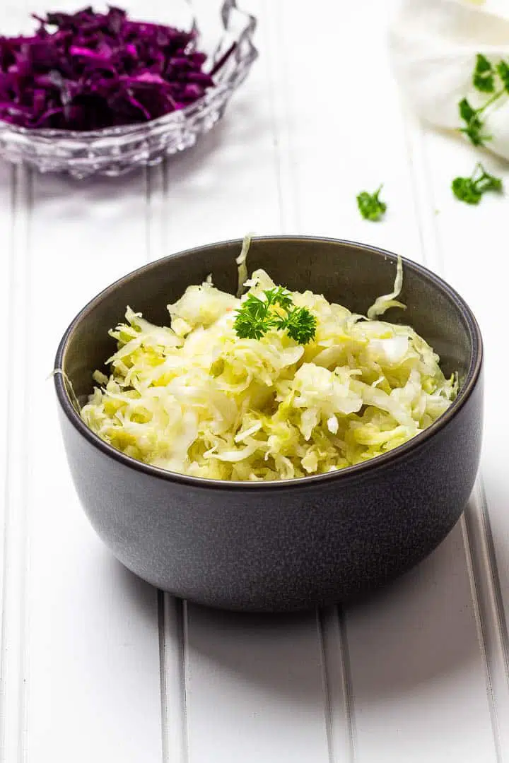 Krautsalat ist nicht das gleiche wie Sauerkraut. Krautsalat ist im Endeffekt die Vorstufe des Sauerkrauts. Beim Sauerkraut wird der geknetete Kohl in Gläser geben und dann zum Fermentieren in einen kühlen und dunklen Ort für ein paar Wochen gestellt. Wenn du Interesse an einem selbstgemachten Sauerkrautrezept hast, dann gebe mir kurz in den Kommentaren oder per Email bescheid. Auch hierfür habe ich ein sehr leckeres Rezept, welches ich jedes Jahr zubereite.